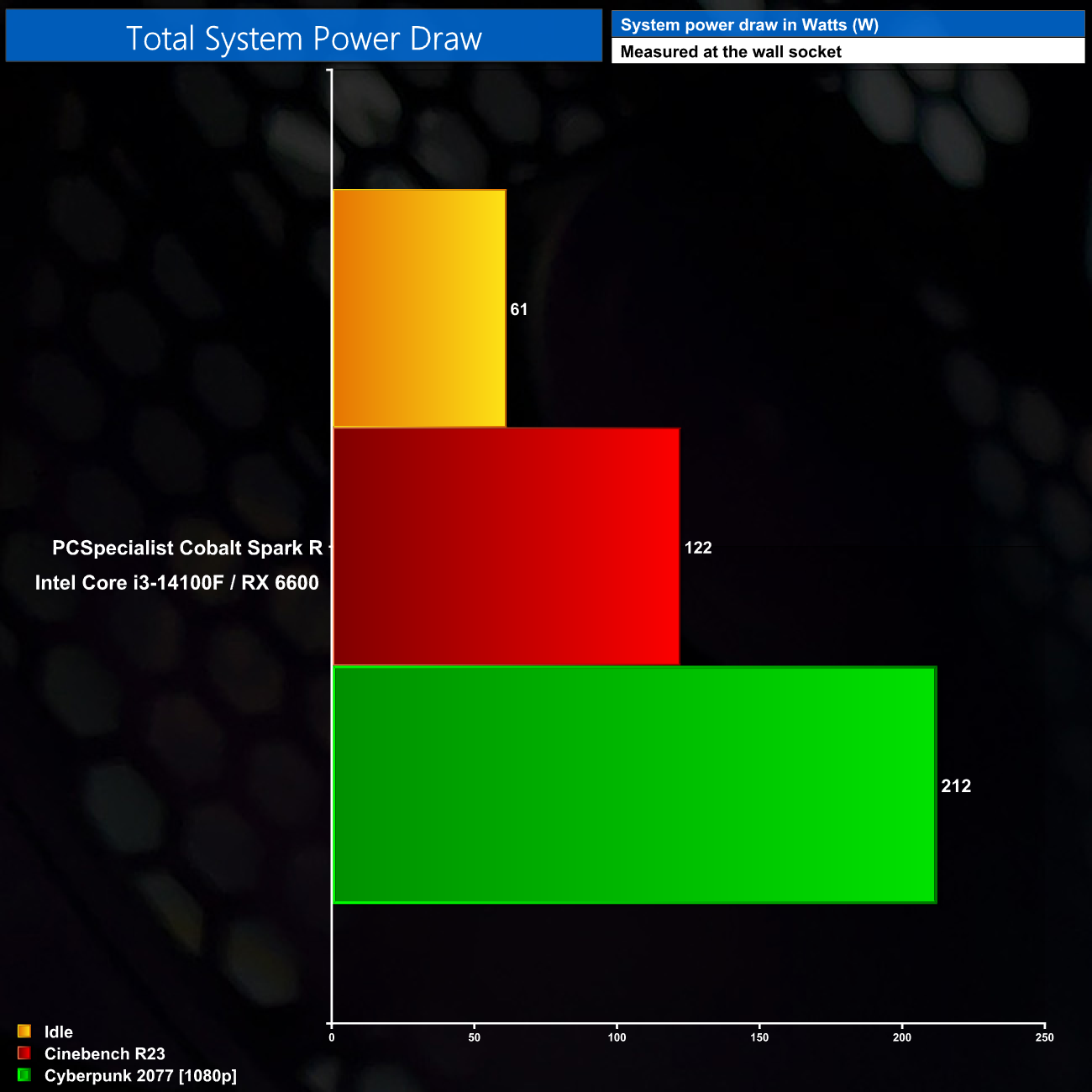 Lastly, power draw is also very low indeed. At full whack in games we saw about 210W at the wall, and this was 90W lower when only loading the CPU in Cinebench. Considering a 650W PSU is installed, that leaves ample room for an upgrade to both the CPU and GPU down the line, which we always like to see.