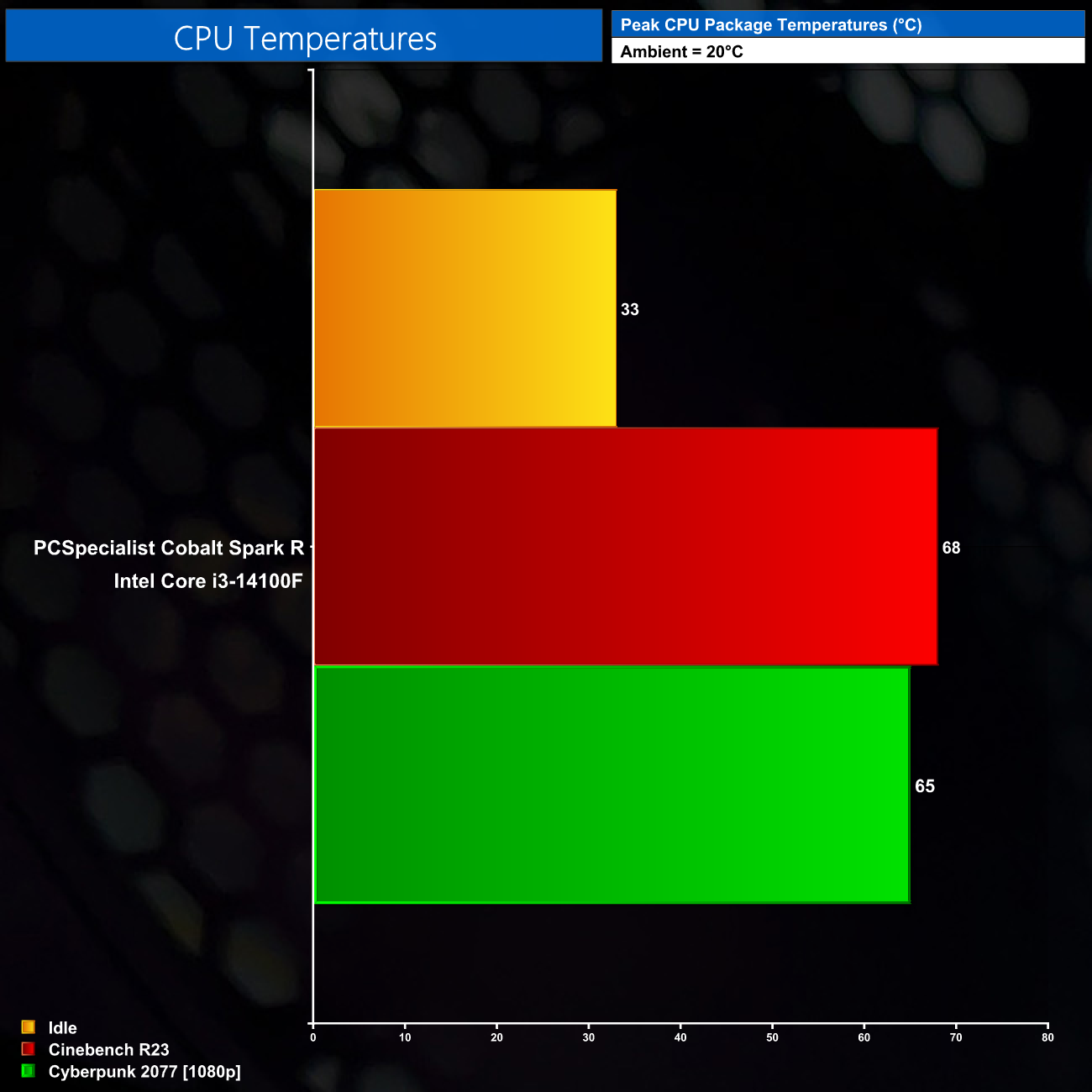 In terms of CPU thermals, the compact PCS FrostFlow air cooler had zero issues dealing with the i3-14100F. During an all-core Cinebench workload, the CPU drew less than 60W package power and it didn't even hit 70C, while we saw similar thermals during a 30-minute stress test in Cyberpunk 2077.