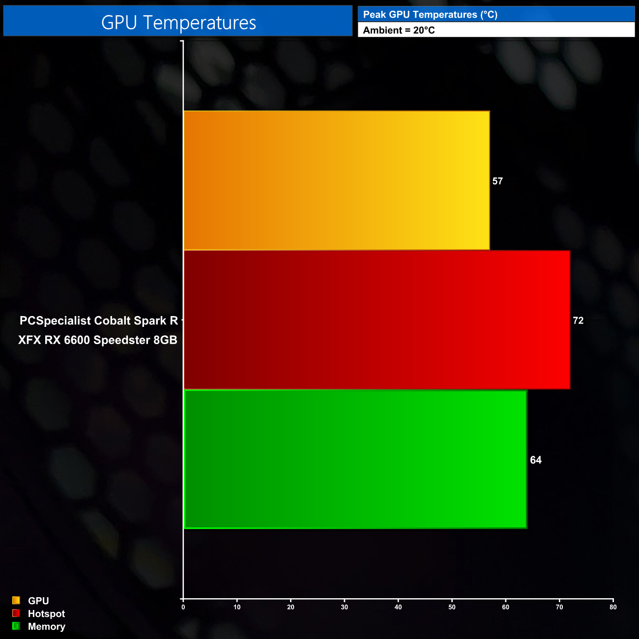 The GPU is also nothing to worry about, with the hot spot hitting just 72C, while the memory ran at just 64C, so it goes to show what happens when you put low-power hardware in a chassis with three intake fans – thermals are very, very good.