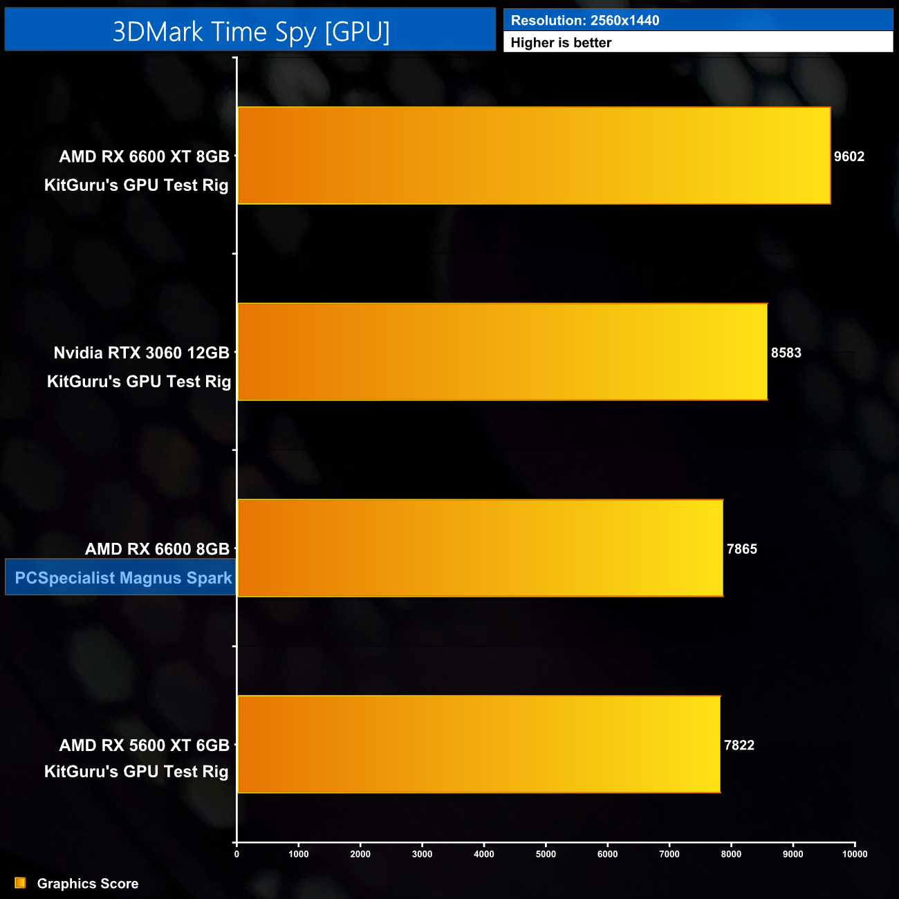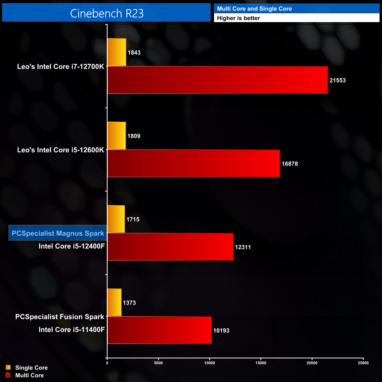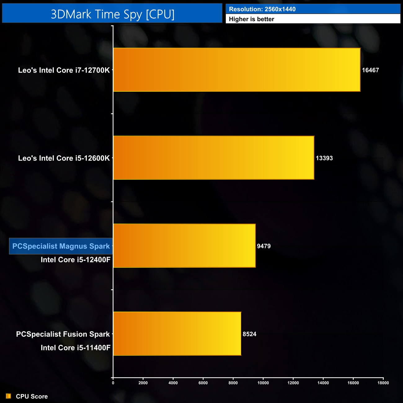 Starting with 3DMark Time Spy, for the CPU score we can see the i5-12400F in the Magnus Spark scores almost 1000 points higher than its direct predecessor, the i5-11400F, as used in the PCSpecialist Fusion Spark. Understandably it lags behind the i5-12600K as that CPU offers an extra 4 Efficient cores, as well as higher clock speeds.