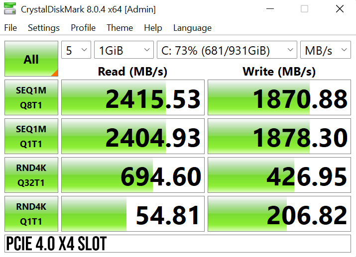 To test what difference this will make to SSD performance, I first ran CrystalDiskMark 8.0.4 with the drive in its original, M.2_3 slot: