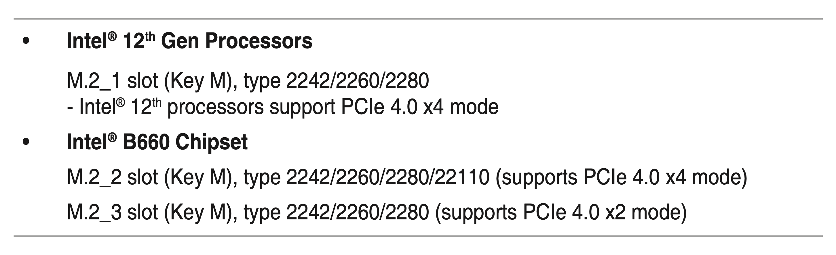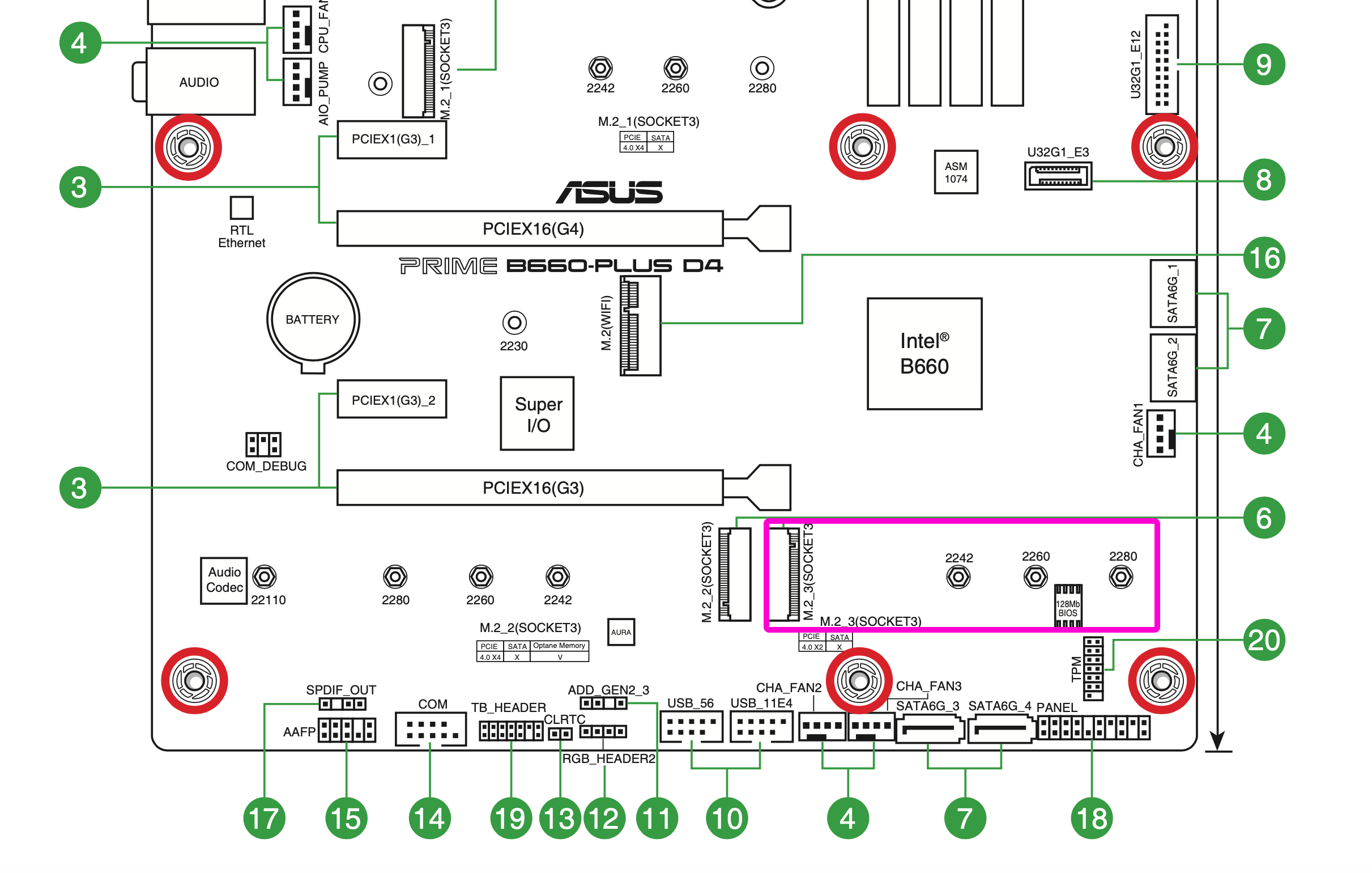 Initially, I just thought it looked a bit odd to shunt the SSD far down the motherboard, in the bottom right corner. Upon checking the B660-Plus D4's manual, we can see that this slot is labelled M.2_3 (I've highlighted it with a pink rectangle):
