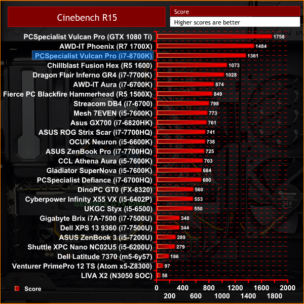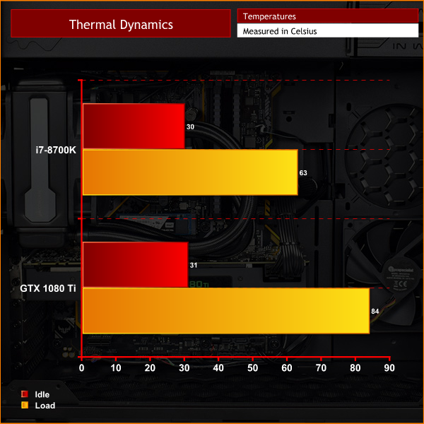 However, the benefit to not overclocking becomes obvious when we get to thermals – a maximum temperature of just 63C for the i7-8700K is almost unheard of. The blower-style graphics card doesn't perform as well as a more sophisticated card would, but it gets the job done.