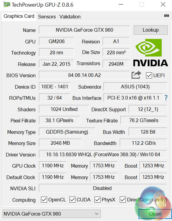 The Asus Turbo GTX 960 2GB has a base clock of 1190MHz and boosts to 1253MHz. A screenshot of GPU-Z is above. For this review, the latest 368.39 GeForce driver was used.