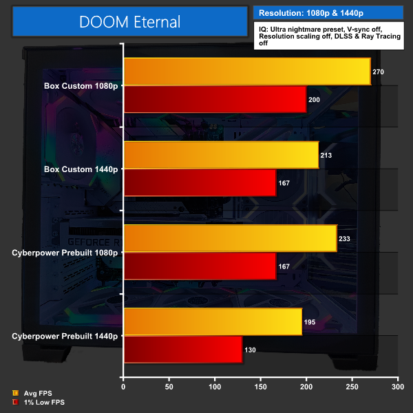 Lastly, our final game was DOOM Eternal and as you’re probably expecting we get a great performance here with a huge 270FPS at 1080p and just shy of 215 FPS at 1440p. This sees our biggest dip in FPS when comparing the systems though with the Cyberpower coming in with 37 FPS less at 1080p but only 18 FPS less at 1440p. Despite that both systems achieve amazing results here.