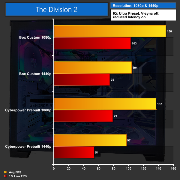 The Division 2 is usually quite a tough one on GPUs, but at 1080p we got a solid 150 average and didn’t go below 100 FPS in the 1% lows either. In 1440p as it stays just above 100FPS average. Again, the Cyberpower system is hot on its heels though with just 13 FPS less in 1080p and just 7 FPS less in 1440p.
