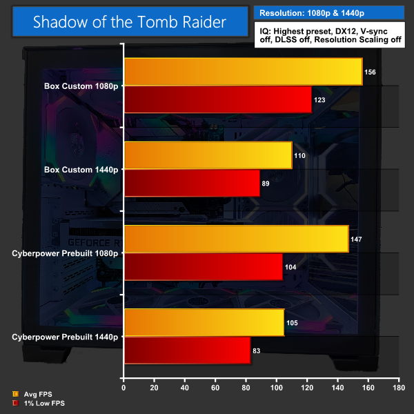 Now a game that is demanding is of course Shadow of the Tomb Raider, on Highest settings with Vsync off we saw excellent results with 156 fps at 1080p and 110 at 1440p. Comparing the Cyberpower results we see, once again, it’s very close. 9 FPS less in 1080p and 5 FPS less in 1440p.