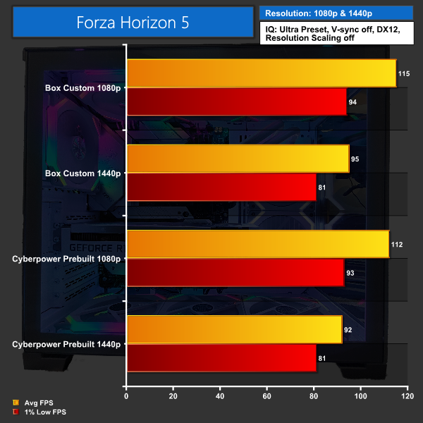 Forza Horizon 5, Ultra preset saw us hit 115 FPS average and 94 FPS for the 1% low at 1080p, and still performs well at 1440p with 95 FPS average and 81 FPS for the 1% low. However, when we look at the Cyberpower system's results, they’re almost identical. We see a dip of 3 FPS average in both 1080p and 1440p.