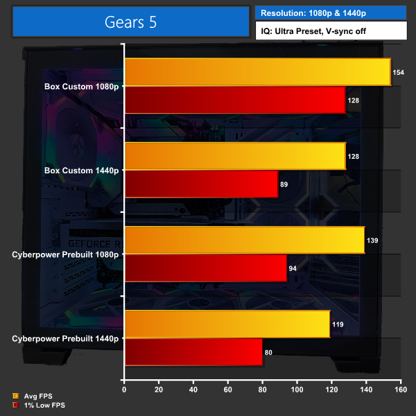 Gears 5, Ultra preset and vsync set to off, held up well almost getting 156fps at 1080p and it’s not too far behind at 1440p too. Looking at the Cyberpower system we do see a larger drop in FPS here with 15 FPS less in 1080p and 9 FPS less in 1440p but that’s not a significant drop in my eyes for the price difference.