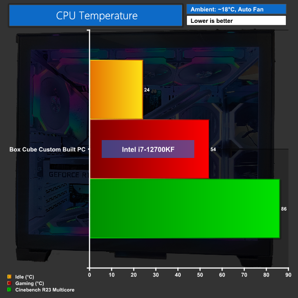 Looking now at temperatures, the Intel i7-12700KF remained relatively cool even when gaming but with an extended multicore run during our Cinebench R23 benchmark we can see it does get quite warm at 86 degrees, but nothing terrible.