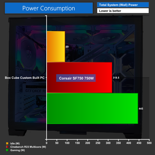 As for power draw, we idle at 89W but under max load when gaming we can see it sits below 450W, which is absolutely fine because we have plenty of head room with our 750W PSU, making it ideal for any potential CPU or GPU upgrades down the line.