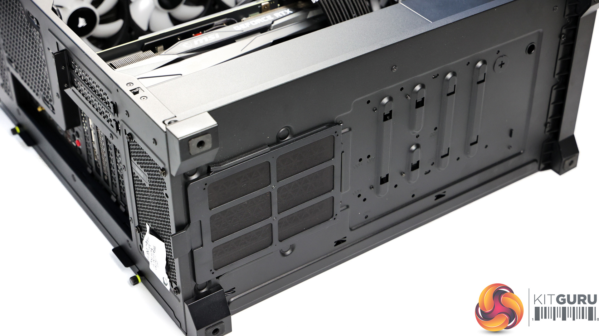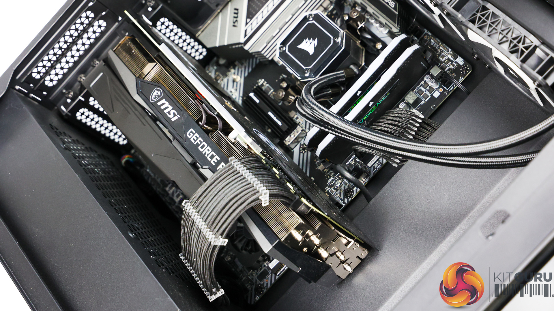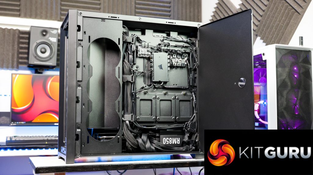 Inside, the system doesn’t look empty with any wasted space here. The MSI RTX 3080 Ti is a massive card, especially with the large bracket underneath it to try and help the inevitable and dreaded GPU sag. The bracket does pretty well though and the GPU only starts to sag at the end where it’s mostly unsupported. Paired with the Corsair H150i Elite 360mm AIO orientated at the top of the case, it definitely helps fill the space with the tubes coming down front the righthand side.