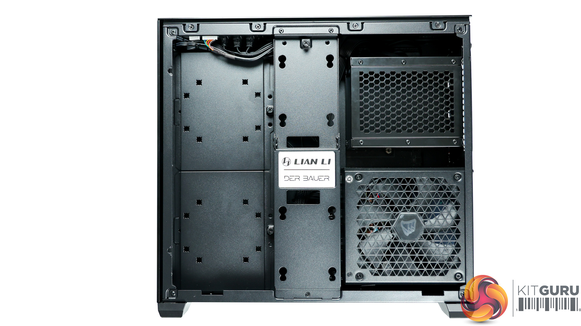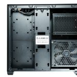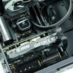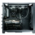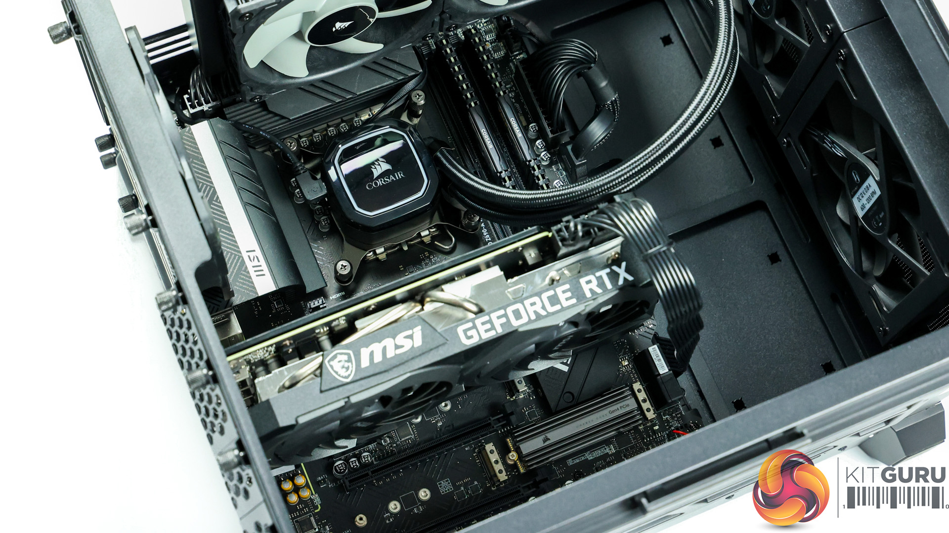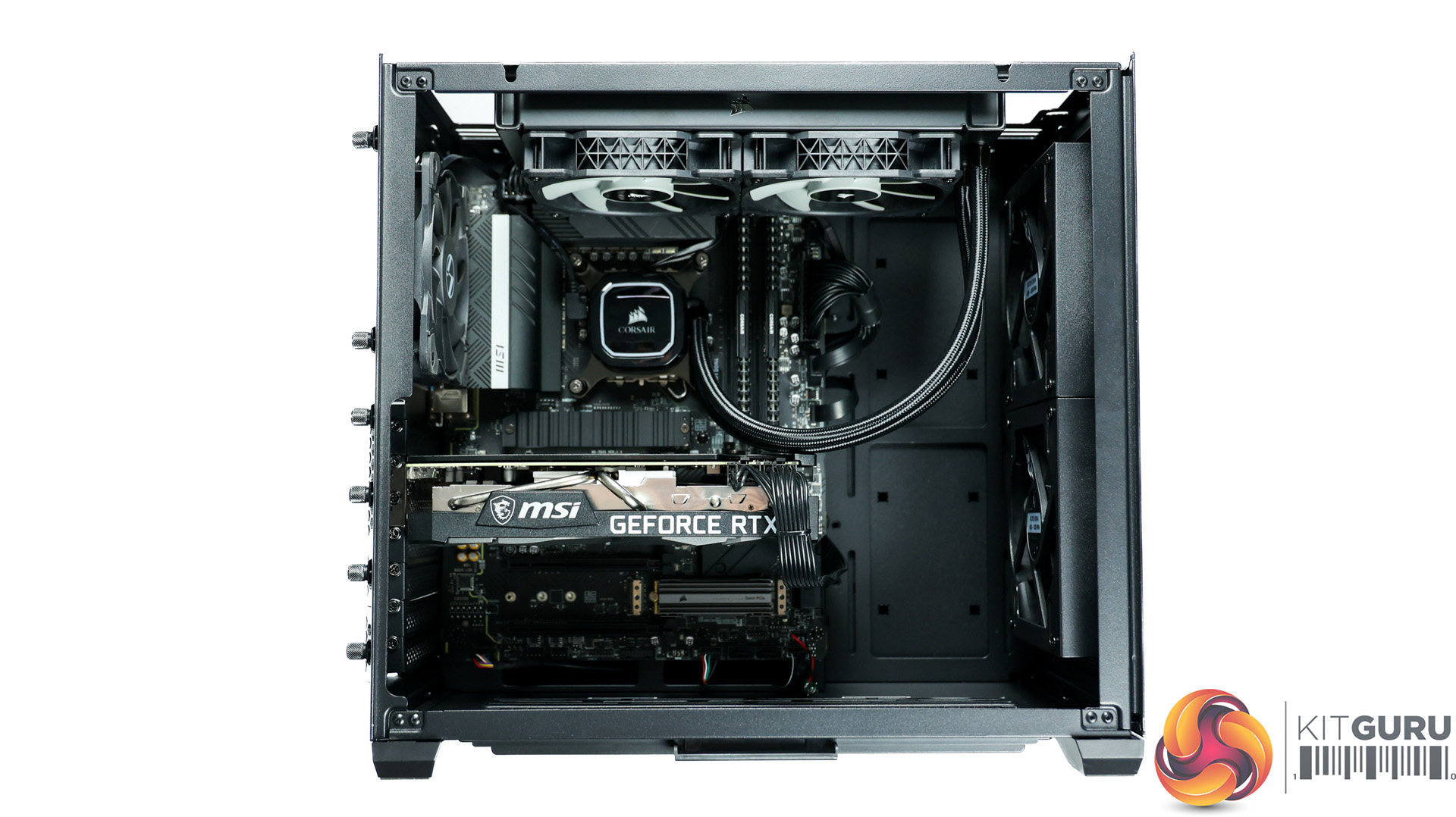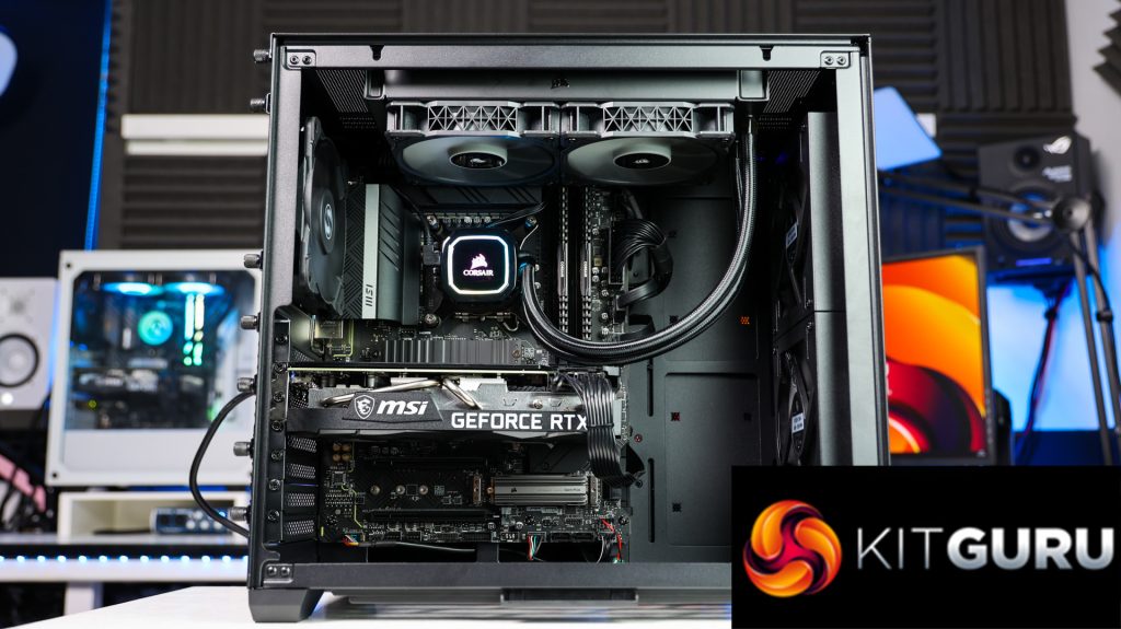 Inside the system there’s a bit of empty space on the right side but this is mainly due to our MSI RTX3070 being a shorter card, but if anything that space should help with our airflow. We have two black 140mm PWM fans as intakes on the front and one black PWM 120mm fan as an exhaust, on the top we have our Corsair H100i Pro XT CPU cooler and radiator mounted above and these too have blacked out fans acting as exhausts too and keeping in theme with the rest of the build.