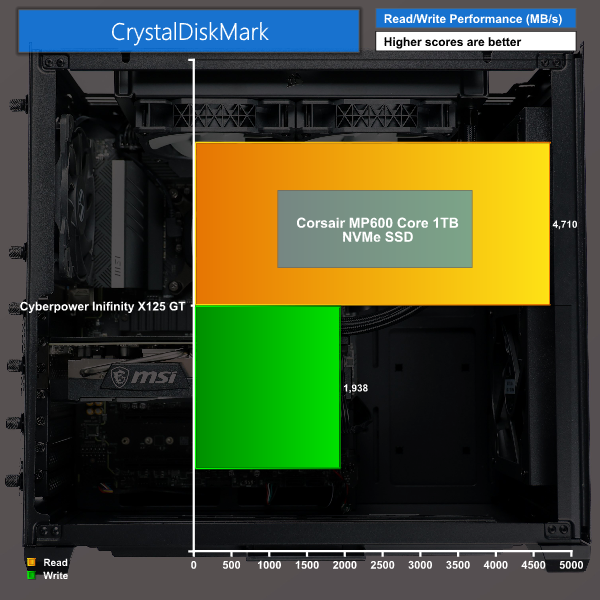 Moving over to CrystalDiskMark to test our Corsair MP600 Core, we see solid read speeds but you can see this drive does slow right down with write speeds, it’s claimed to offer 1950MB/s writes and we just fall short of that. This is the MP600 Core version, which is an entry level PCIe 4.0 drive and clearly has been chosen to keep cost down, though the read speed is still quick and this is what matters for gaming. Just be aware, if you were planning to run some write-intensive tasks, this drive won’t be the best choice for you.