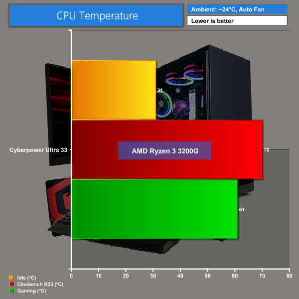CPU temps idled nice and low, rising up to 70C during Cinebench and 61C during gaming, considering we just have a tiny Ryzen Wraith cooler I think that’s a good result.