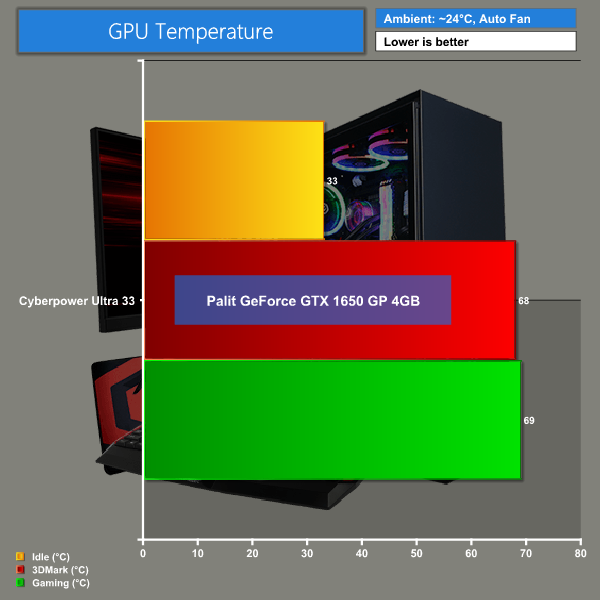 GPU temps idled very low as well, rising to hit 69C during gaming and pretty much the same during 3DMark stress testing, as we’d expect.