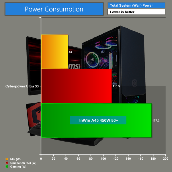 In terms of power draw, the system idles at around 40W, rising up to nearly 114W during an extensive Cinebench R23 run, but increasing to 180W while gaming, leaving us plenty of headroom on our 450W PSU.