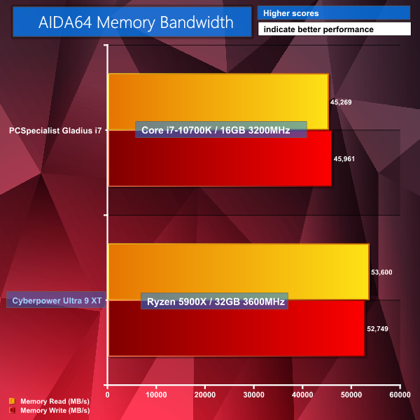 Looking at our memory benchmarks also shows our system take a strong win against the PCSpecialist system, but again we have double the RAM that also runs at higher frequencies.