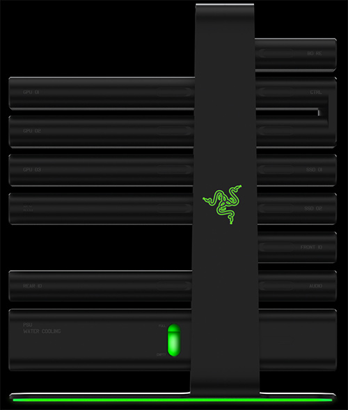 The cable-less design of each sealed module is entirely self-contained and features active liquid cooling and noise cancelation, which allows Razer to factory overclock components without voiding warranties, safely and quietly. The system also features a touch-screen LCD display that indicates control and maintenance information.