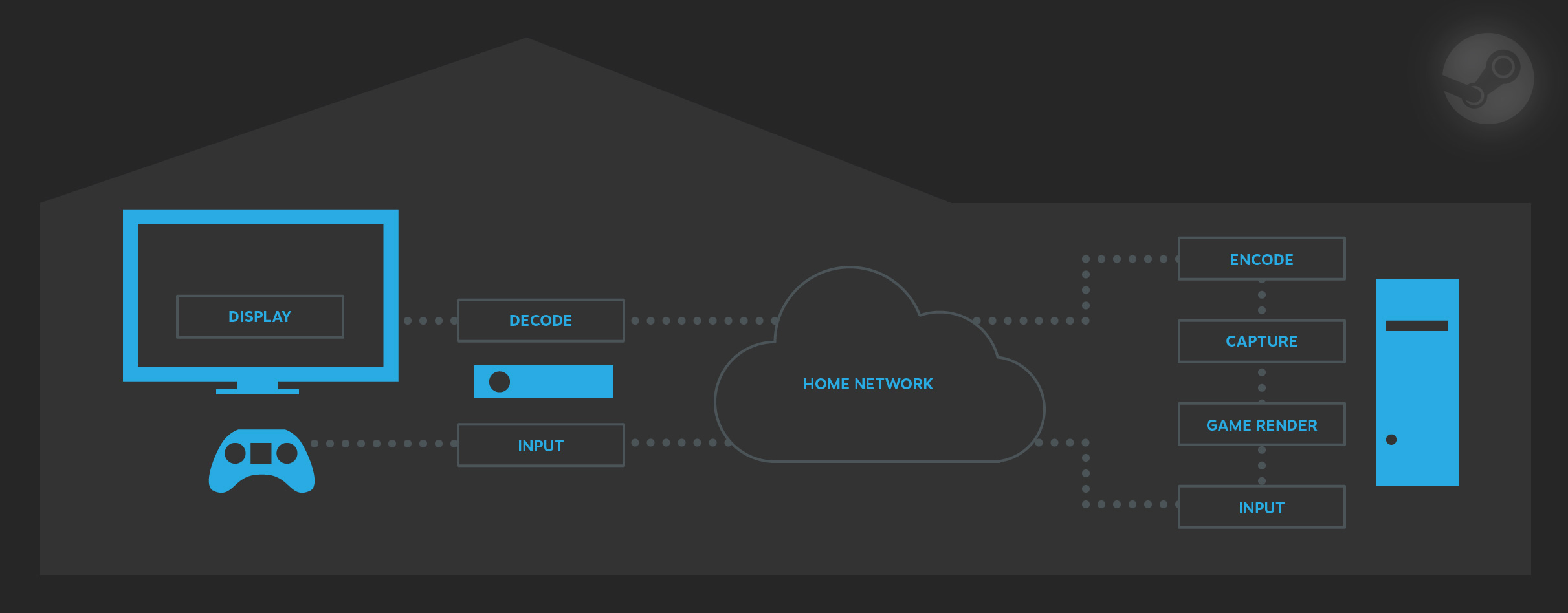 Through Steam, game audio and video is captured on the remote computer and sent to the player’s computer. The game input (keyboard, mouse or gamepad) is sent from the player’s computer to the game process on the remote computer. According to Valve, the input lag is very low and can be counted “in milliseconds”. Users are further able to change preference for speed vs. quality, limit the network bandwidth, and adjust the maximum capture resolution.