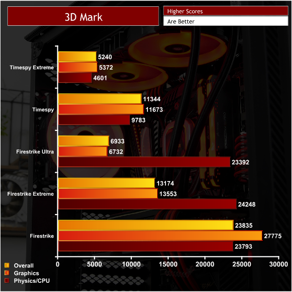 The results for the 3DMark tests are impressive and show the Dragon Army One to be a very capable PC at all resolutions. Being such a high end PC this is pretty much as expected but it also allows us to see that the CPU and GPU appear to be a well matched pair perfect for gaming.