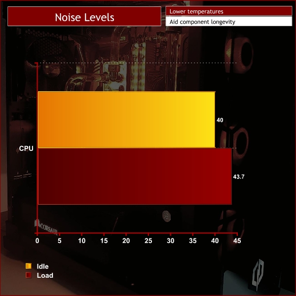 We measured fan noise levels using a sound meter while the PC was idle with no programs open, and then during stress testing to get a reading with the system under load.