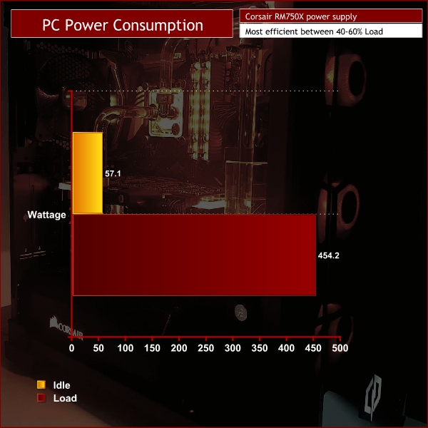 As expected from a system like this, the total power consumption is around the 450W mark, making the 750W power supply look like a sensible choice given it will be operating at peak efficiency in this system.