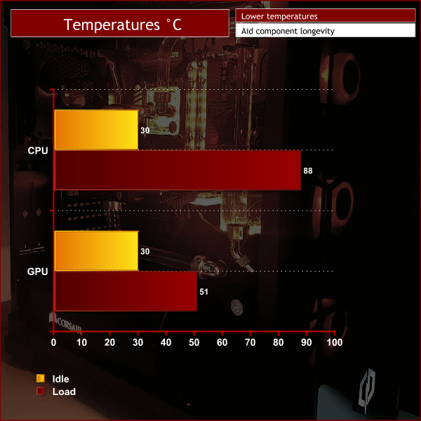 Idle temperatures are very good with both the CPU & GPU only a few degrees above ambient. Under load the overclocked i7-8700K reached 88C which is quite warm, but without delidding the CPU it is to be expected given the 4.8GHz overclock. The GPU is the star of the show barely going above 50C, meaning there is plenty of room for an overclock to get more gaming performance and shows that the custom loop is doing its job.