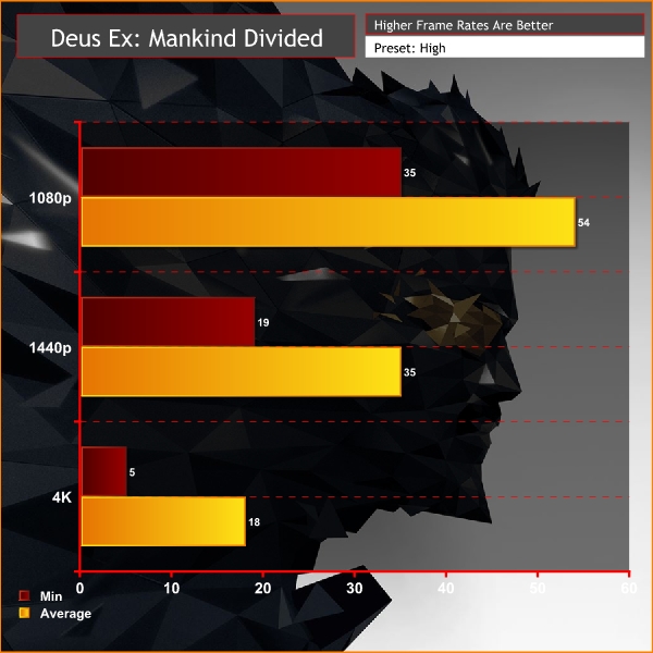 Deus Ex: Mankind Divided is perhaps the most demanding game of our test selection, forcing us down to “High” quality preset for half decent results with the GTX 1060 6GB. Since the title doesn't have its own built-in benchmark, I will be benchmarking the introduction to the game.