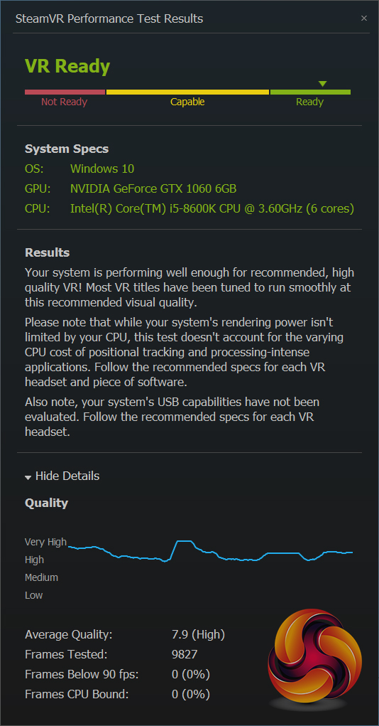 The SteamVR Performance Test measures your system's rendering power using a 2-minute sequence from Valves Aperture Robot Repair VR demo. After collecting the data it determines whether your system is capable of running VR content at 90fps and whether VR content can tune the visual fidelity up to the recommended level or beyond. For machines that are not VR Ready the tool can help determine whether capabilities are bound by Graphics Card, CPU, or both.