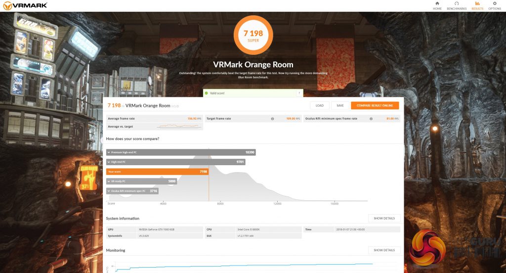 VRMark's Orange Room is the standard test, with the results echoing that of the SteamVR Performance Test. The Cyberpower Infinity X66 GTX is definitely a VR ready system, however, while the system can run the platform relatively smoothly, it will struggle with more demanding settings.