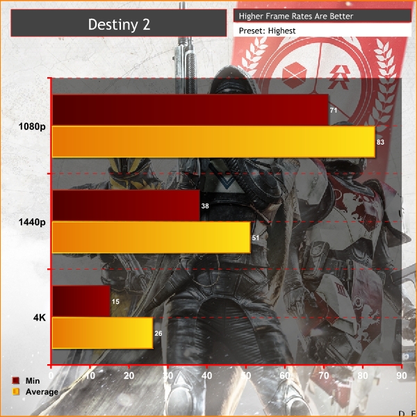 To keep the test fair, all settings remained the same throughout testing Destiny 2, with only the resolution changed for comparison. Testing Destiny 2 is slightly harder than usual, given that Activision has prevented almost all third party applications from helping out. Without Fraps at my side, tests were instead conducted using a combination of the in-game frame counter, OBS and near-constant observation.