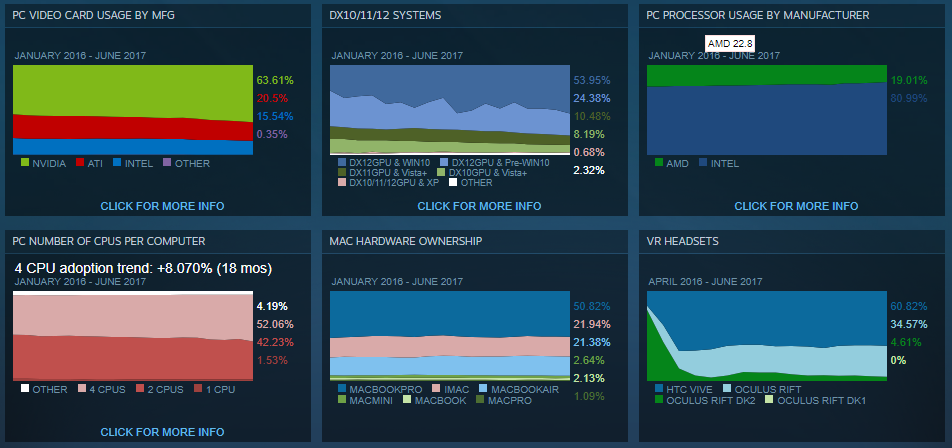 The Steam hardware and software survey for June has been published by Valve, giving us a look into what gamers are currently running. Many users seem to have made the jump to 4-core processors and although Windows 10 has seen a slight increase, Windows 7 is still operating on over a third of the user base.