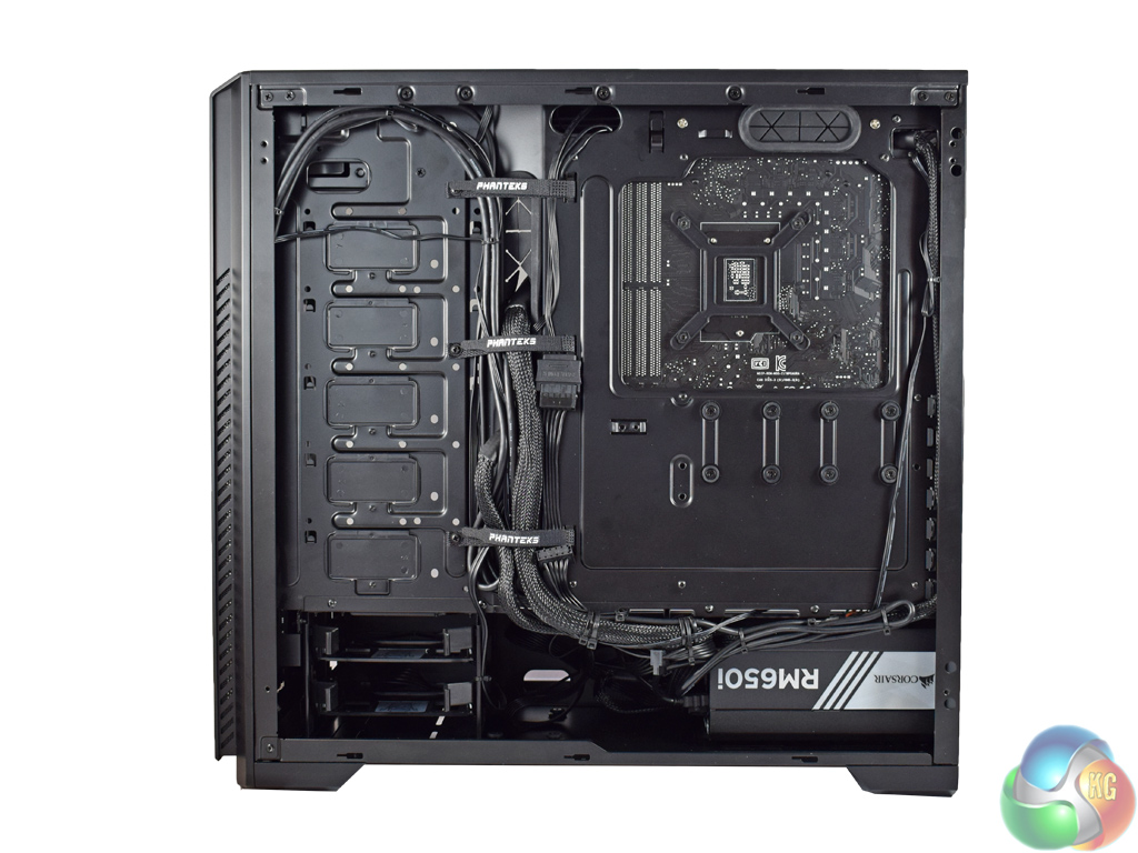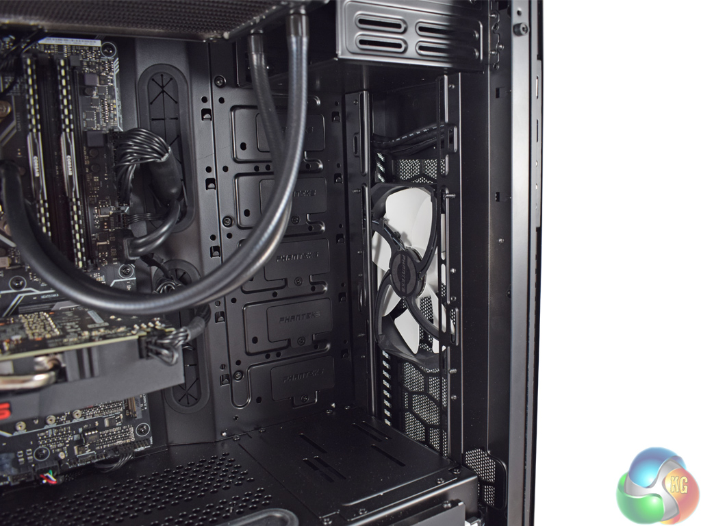 At the bottom of the case, Phanteks have included a ventilated PSU shroud. It has several cutouts for front-panel connectors which AWD-IT have utilised very well – the cables are barely visible.