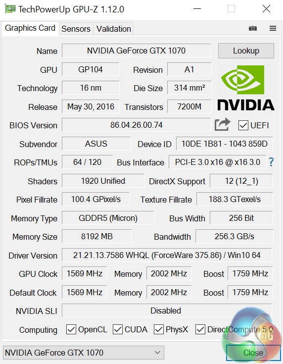 The GTX 1070 here has a 1569MHz base clock, while it boosts to 1759MHz. In reality, though, I saw it boosting up into the 1900s thanks to GPU Boost 3.0 technology. It is equipped with 8GB of GDDR5 memory which operates over a 256-Bit bus.