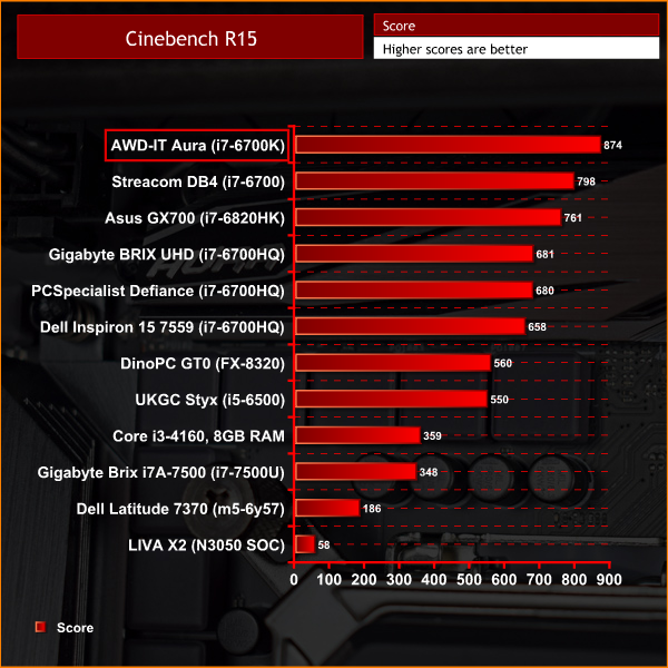 Again, the Aura goes to the top of our Cinebench chart thanks to the strong overclock on the i7-6700K. Cinebench does favour more cores over clock speed, but as the fastest quad-core chip I have tested to-date, it claims its place at the top of the chart.