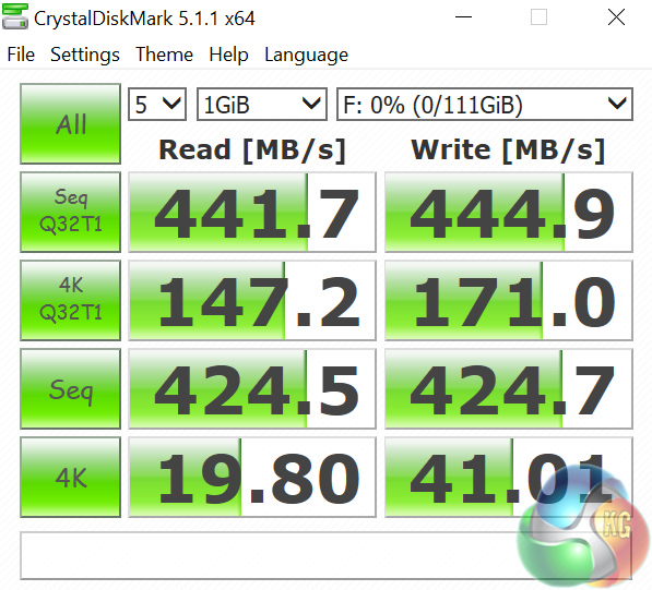 To test the USB 3.0 ports on the Aura, I plugged in an OCZ Trion 150 SSD via a SATA-to-USB 3.0 5Gbps adapter, which uses the ASMedia ASM1053 controller. We reviewed the SSD HERE, finding it delivers good speed at a budget price.