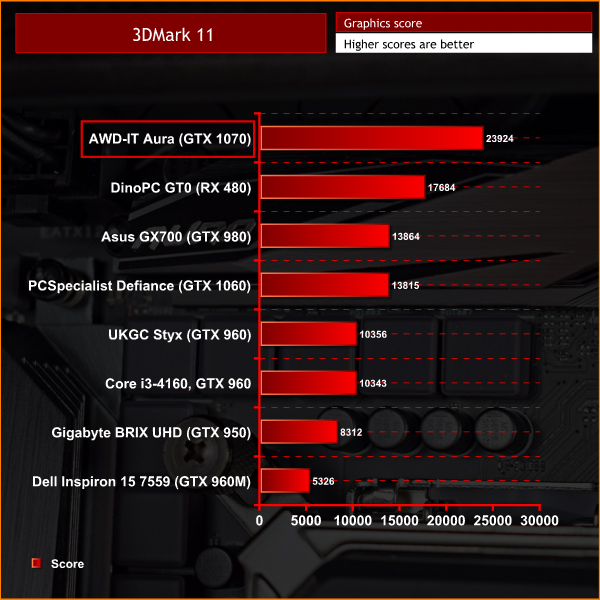 Another top spot for the AWD-IT Aura. The GTX 1070 comes in over 6000 points above the RX 480. This certainly bodes well for real-world gaming performance.