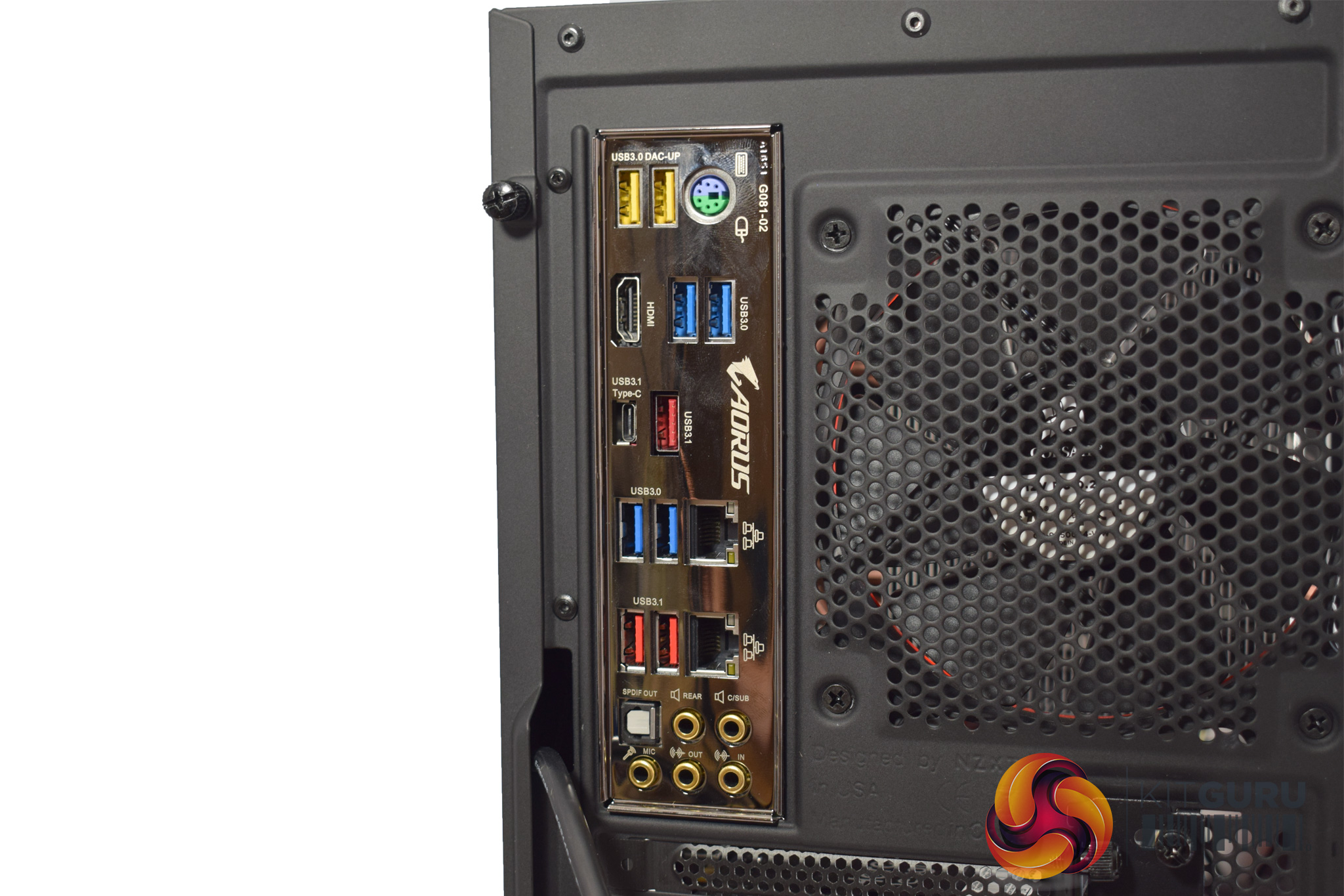 Before moving behind the motherboard tray, we will look at the motherboard's I/O. The Aorus AX370 Gaming 5 has the following ports and connectors: 1 x PS/2 keyboard/mouse port, 1 x HDMI port, 1 x USB Type-C port, with USB 3.1 Gen 2 support, 3 x USB 3.1 Gen 2 Type-A ports (red), 6 x USB 3.1 Gen 1 ports, 2 x RJ-45 ports, 1 x optical S/PDIF Out connector and 5 x audio jacks (Center/Subwoofer Speaker Out, Rear Speaker Out, Line In, Line Out, Mic In).