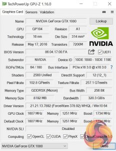 The Inno3D GTX 1080 is equipped with 8GB of GDDR5X VRAM, and it has been left at stock frequencies: 1607MHz base clock, 1734MHz boost clock. GPU Boost 3.0 should take it well above those frequencies, though.