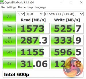 The Intel 600p is an interesting SSD – it uses the NVMe protocol but is significantly slower than other NVMe drives, such as the Samsung 960 EVO or OCZ RD400. That being said, it is quite a lot cheaper, and still faster than a traditional SATA-based SSD, so it is good to have in this system.