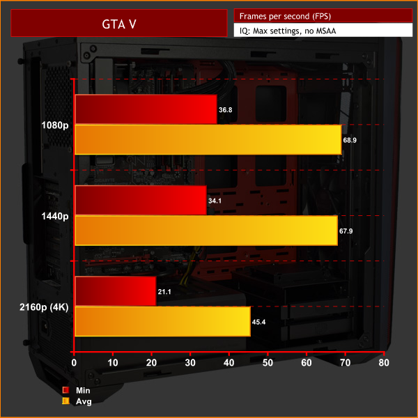 With GTA V, we see some significant CPU bottlenecking – as we saw with Ryzen 7. This is made clear by the fact that the 1080p and 1440p results are essentially identical.
