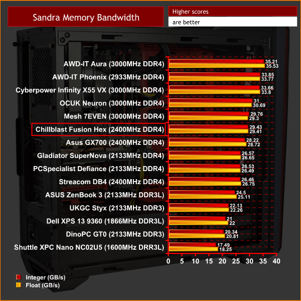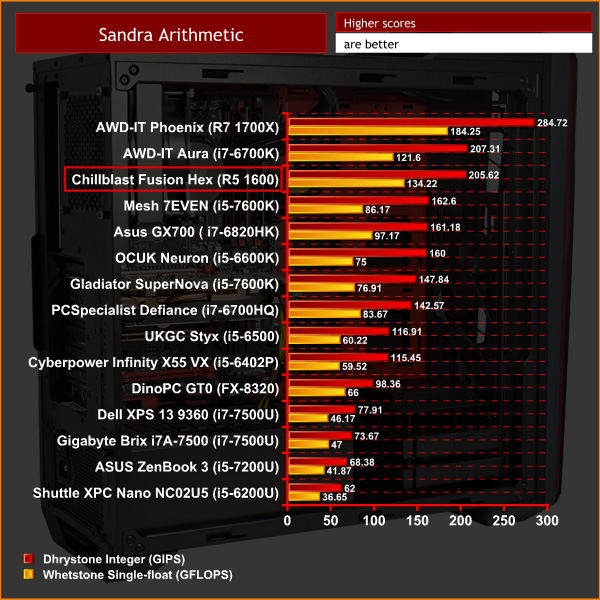 The Fusion Hex gets off to a good start with the Sandra Arithmetic test. The R5 1600 clearly offers strong computational performance, though the i7-6700K does just pip it to the post, likely because that chip was overclocked to 4.5GHz while this 1600 has been left at stock clocks.