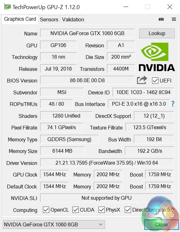 The GTX 1060 used here is the 6GB variant, with the full 1280 CUDA cores. The VRAM is GDDR5, operating over a 192-Bit bus. With a certified boost clock of 1750MHz, thanks to GPU Boost 3.0 the actual boost clock is much higher.