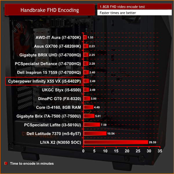 The last of our CPU-specific tests, Handbrake confirms what we have already seen – performance from the i5-6402P is as expected given its relatively low clock speed and lack of HyperThreading. Still, it manages to tie with the i5-6500 here.
