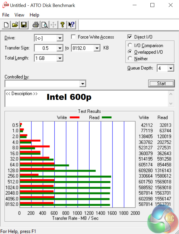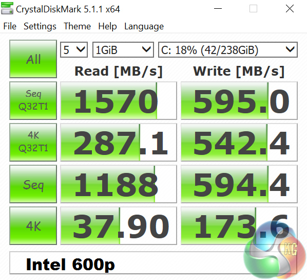Starting with the Intel 600p, this SSD does not perform as well as some other NVMe drives – such as the 960 Pro, for example. However, it is a budget PCIe drive and still offers read speeds of around 1500MB/s and write speed around the 600MB/s mark – faster than a SATA drive, that is for sure. For the price, a SSD like this is good to see in the Infinity.