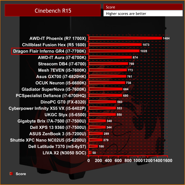 Cinebench also benefits from the strong 4.8GHz CPU overclock, as the i7-7700K is only just behind the 6-core Ryzen 5 1600 CPU.