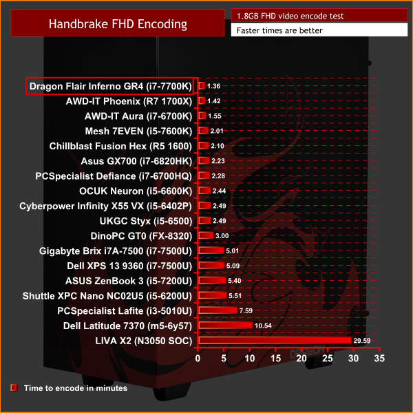 The Inferno takes the lead in our Handbrake test, and this must be due to the high overclock on the i7-7700K.