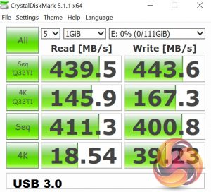 Most importantly, it is capable of saturating the USB 3.0 bus, allowing us to test the speeds the USB 3.0 ports deliver. To test this, I ran both CrystalDiskMark and ATTO Disk Benchmark on the Trion 150 drive.