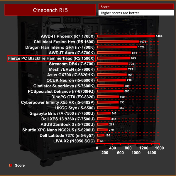 Cinebench R15 puts the R5 1500X processor just behind Intel's i7-6700K chip. Considering systems using the i7-6700K or now i7-7700K retail for significantly more than the Blackfire Hammerhead, this is definitely a good result.